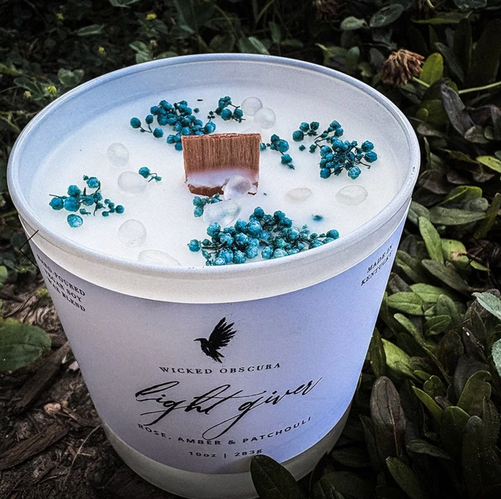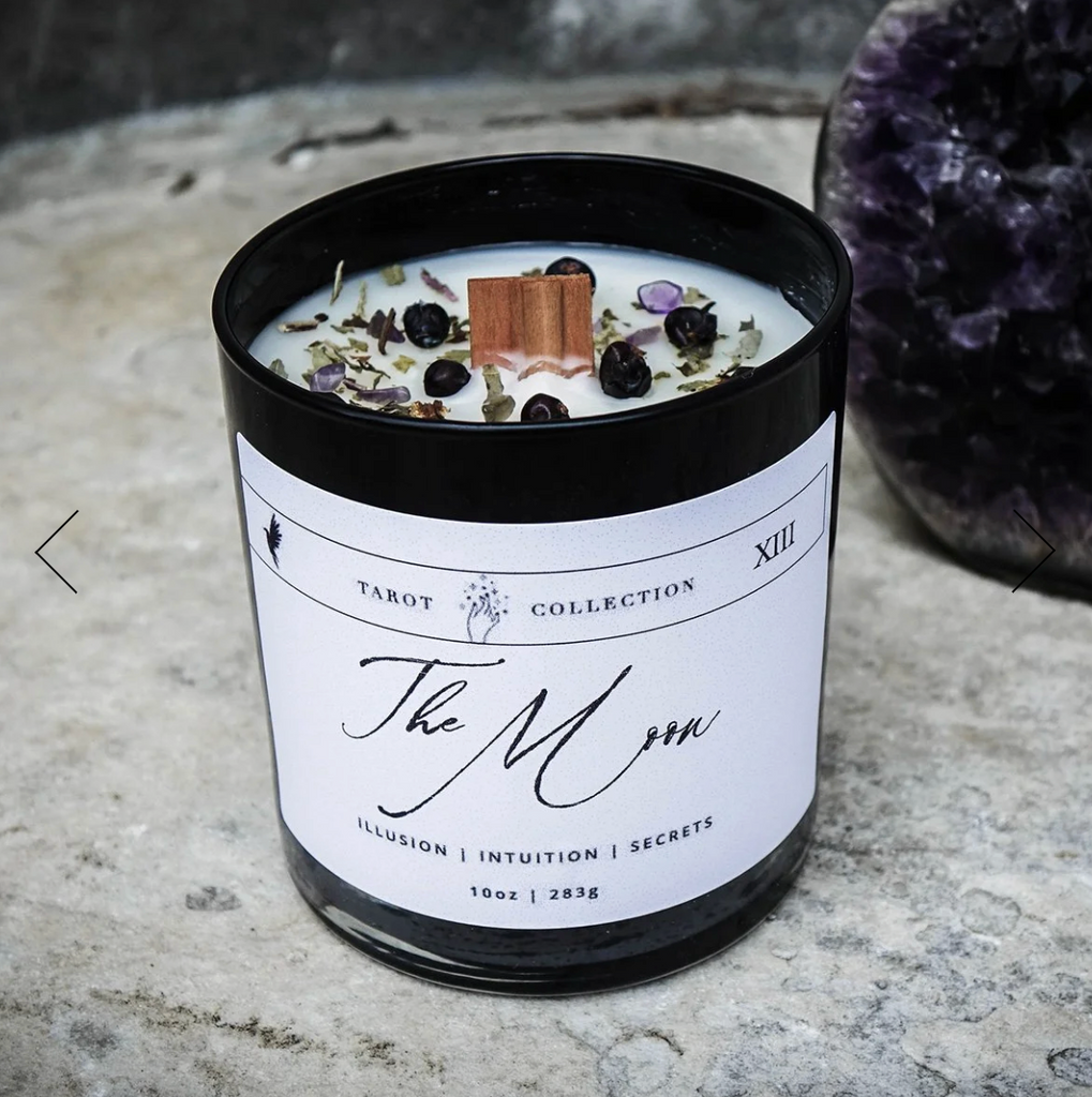 Your Candle Comes In: A 10 oz white glass jar, wood wick and silver metal lid. It’s topped with dried rose buds, dried hibiscus, cornflower, and black tourmaline semi-precious stones for protection and spiritual growing.